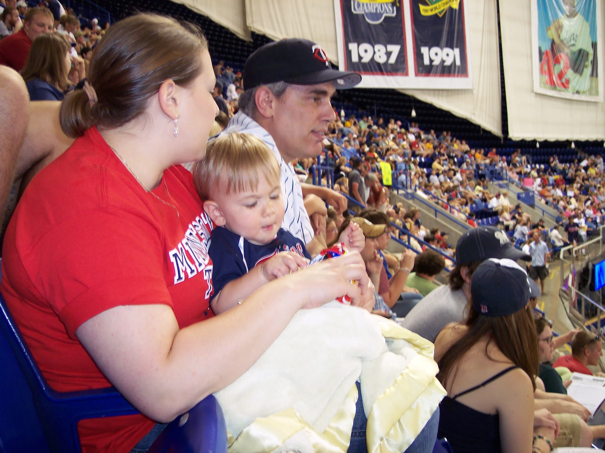 Stephanie and I went back up to Minnesota this past weekend to celebrate Independence Day and take Jack to his first baseball game. We left my parents house at 10:45 a.m. Saturday morning (July 1st) and with all the construction leaving Illinois, we barely made the 6:10 p.m. start time for the Twins vs. Brewers game. Jack was all decked out in his Twins gear rooting the team to a 10-to-7 victory over the Milwaukee Brewers. With a combined 27 hits and 17 runs, neither team hit a home run. Jack was accompanied by Stephanie and myself, Megan, Mike, Debbie, Aunt Susie, and Grandma B.